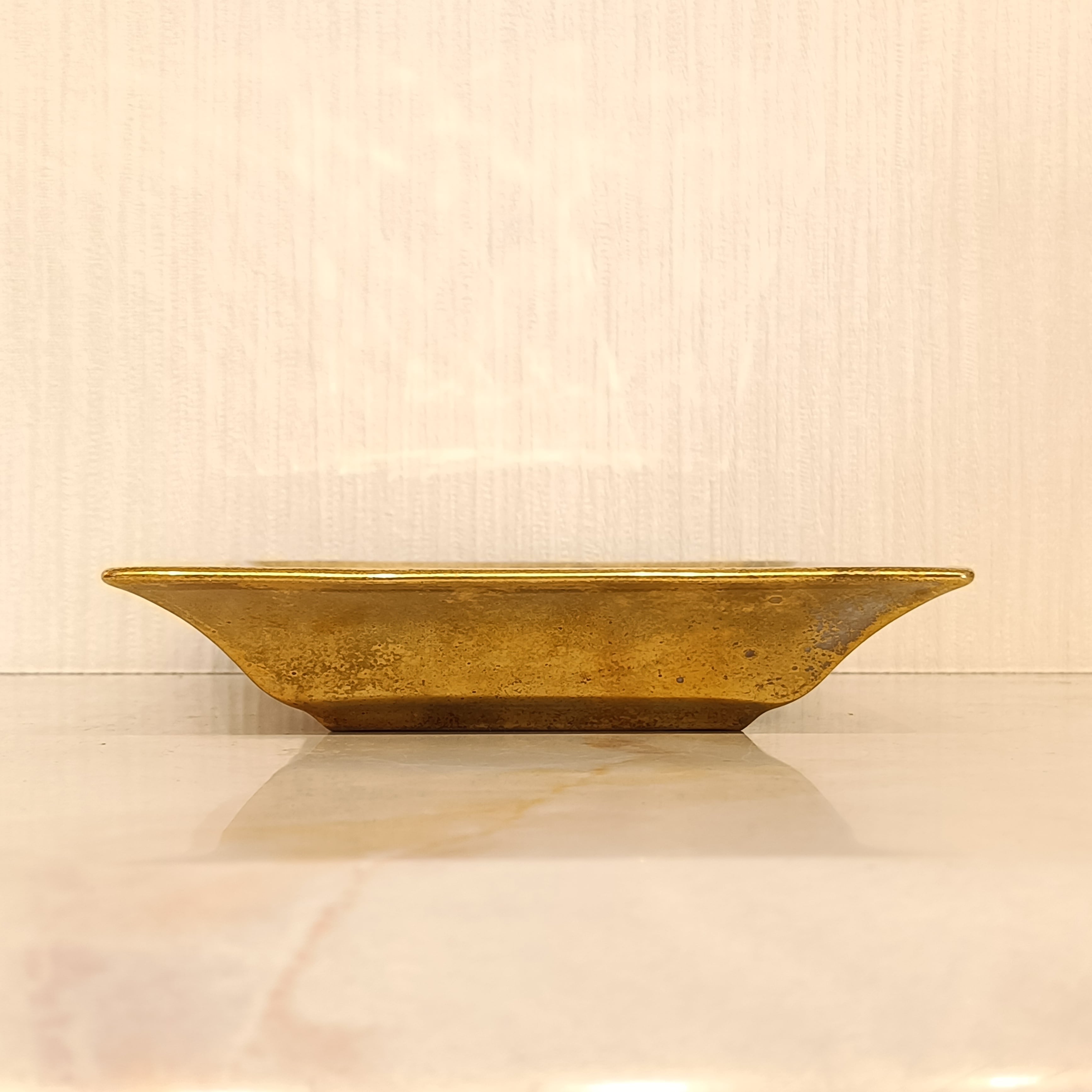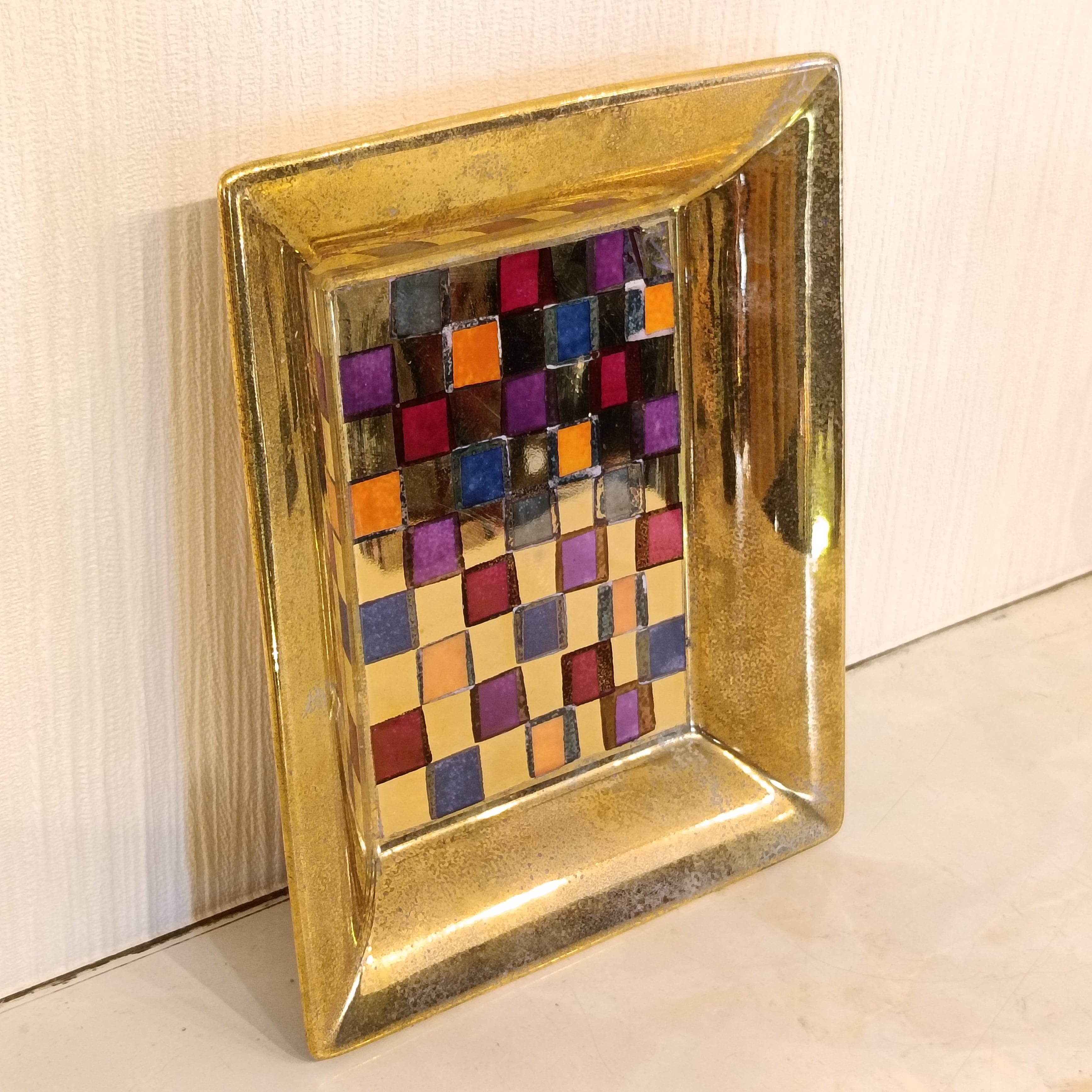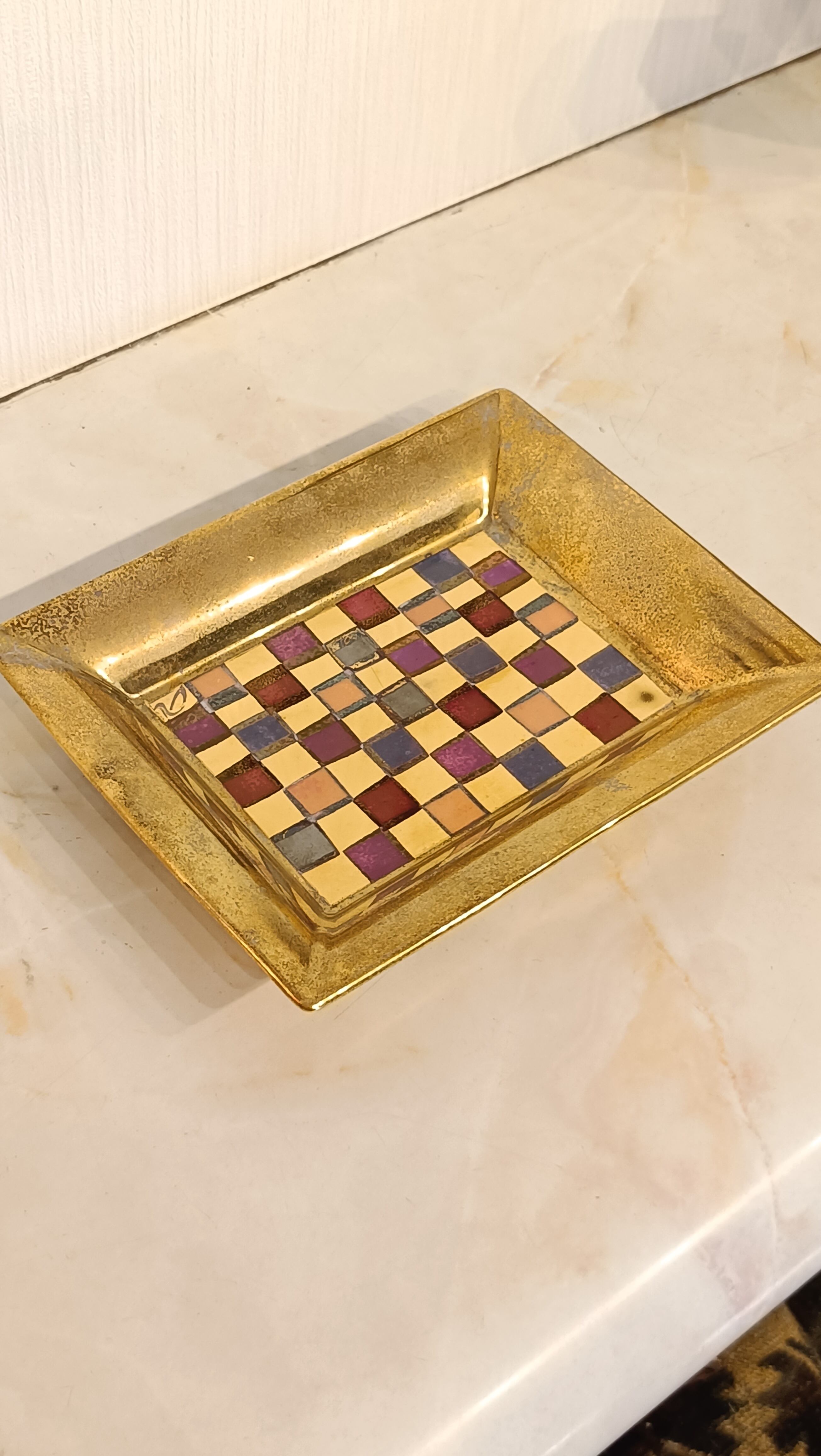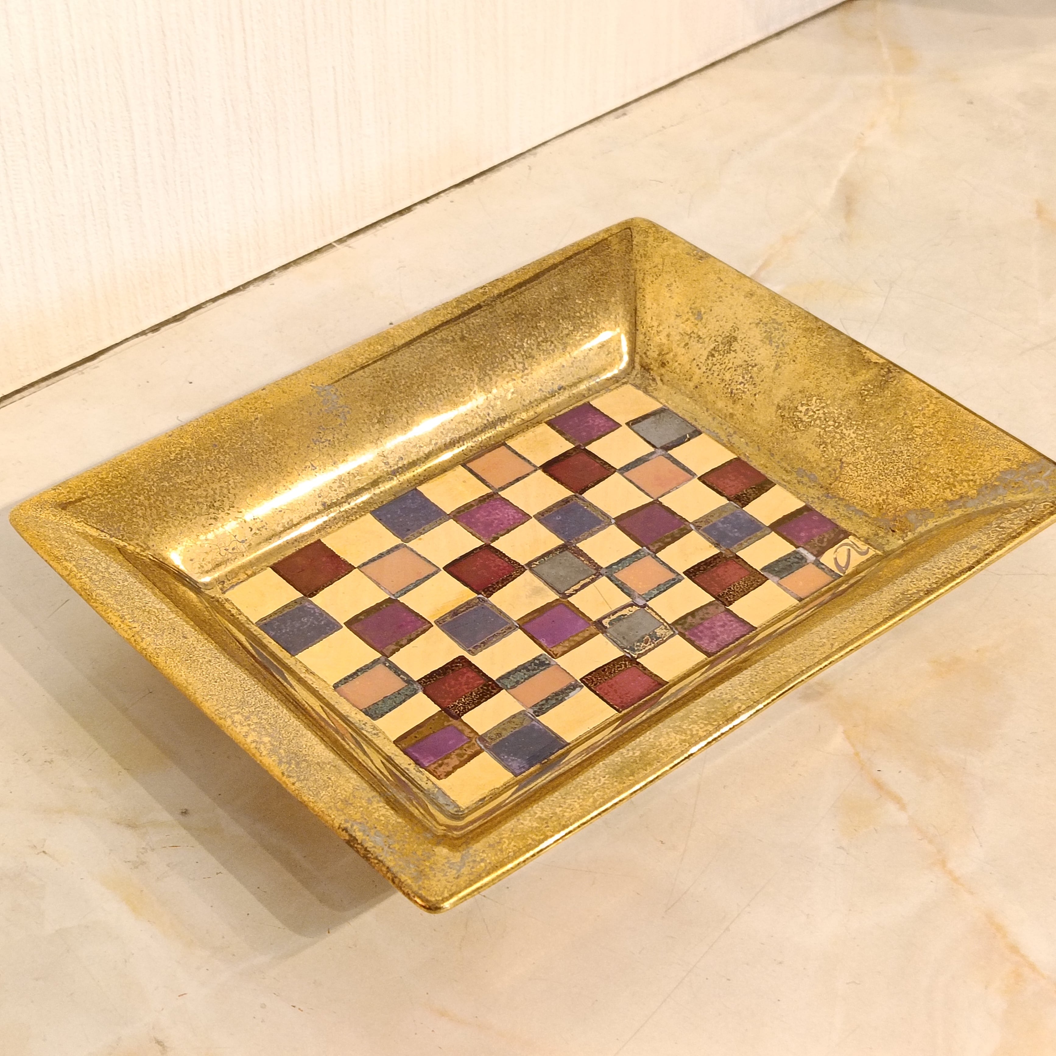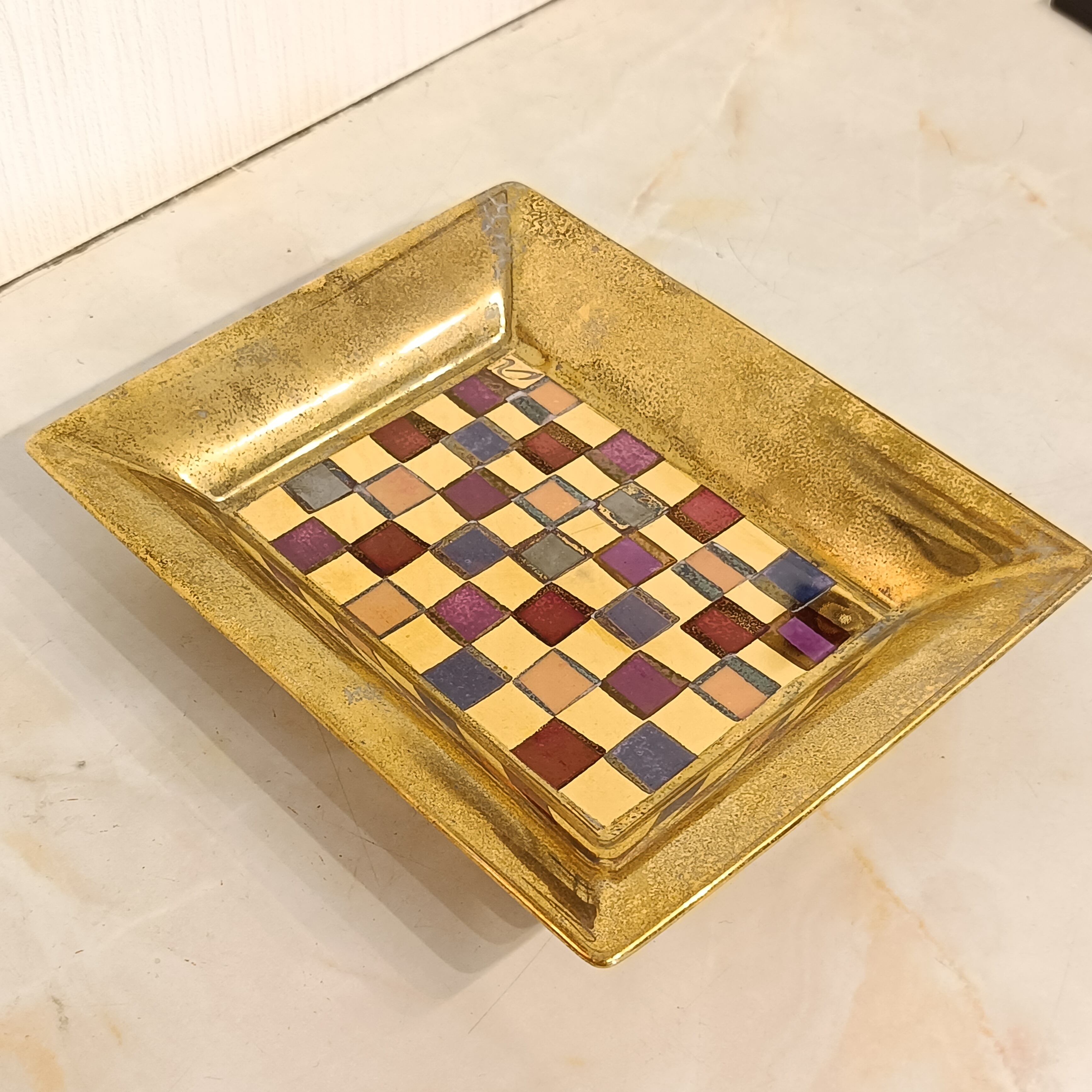 素材は陶器にメッキデザインが施されている感じです。もとのブランドのロゴマークが上塗りされてしまっているので不明ですが、厚みもありしっかりとしたトレイなので、良いブランドの物だと思います。